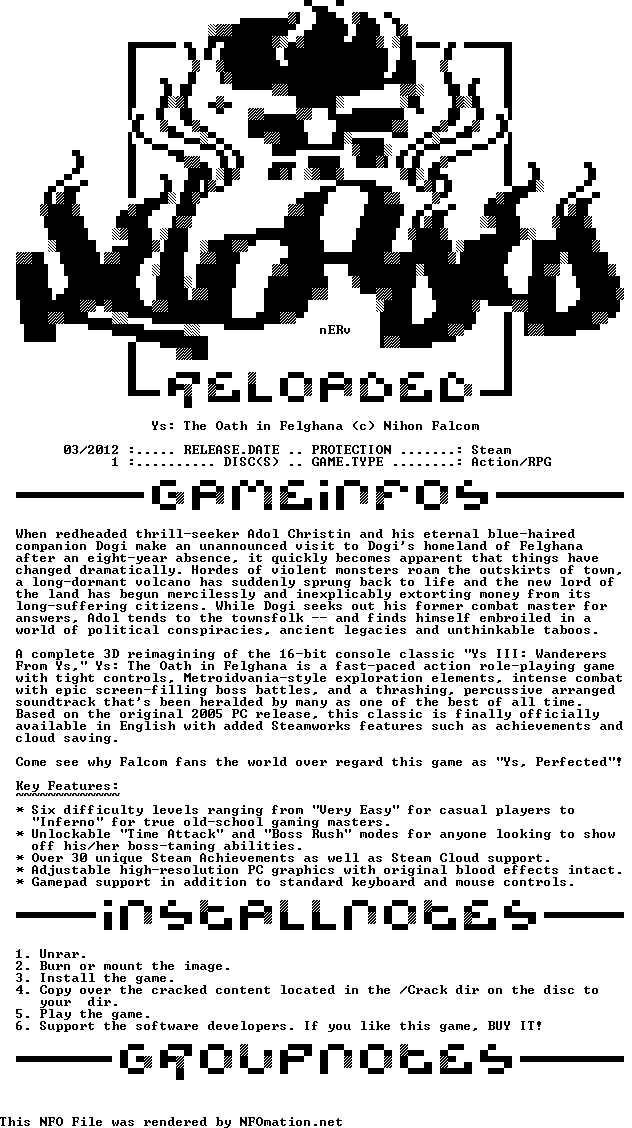 | Ys: The Oath in Felghana Full indir download Oyun Hakkında Bilgi</I>: Çıkış Tarihi : Mart 2012 Oyun Türü : Aksiyon/RPG Nfo NFO</I>: ![]() Sistem Gereksinimleri Sis. Bilgisi</I>: OS: Windows XP Processor: Pentium III 800 MHz Memory: 1 GB RAM Graphics: 32 MB VRAM, 3D accelerator compatible w/ DirectX 9.0c DirectX®: 8.0 Hard Drive: 1 GB HD space Sound: Compatible with DirectX 9.0c Crack : Mevcut Dil : İngilizce Dosya Türü : Sanal Sürücü (.iso) Açabilmeniz için önerdiğimiz program : Alcohol %120 veya Daemon Tools (Daemon Tools Lite programını indirmek ve resimli kurulumuna bakmak için TIKLAYIN!!!) Part Sayısı: Tek Link Boyut: 1.3 GB |